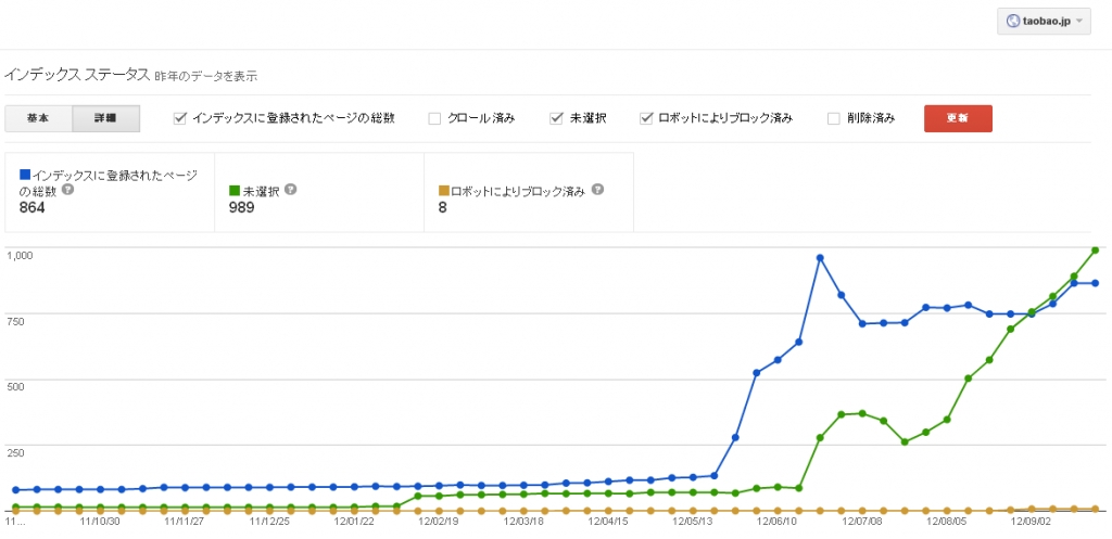 詳細グラフで「インデックスに登録されたページの総数 」と「未選択」をご注目ください。